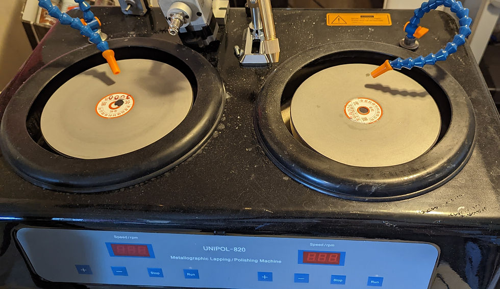 Unipol 820 polishing/lapping machine. (not shown - robotic cnc collet indexer/faceting engine or lapping jigs) This system allows us to do Chemical mechanical planarization, wafer backside thinning, lapping, polishing and faceting of wafers, crystals, ceramics, glasses, metals and much more by simply changing the lapping plates, adding a slurry pump and different fixturing systems.